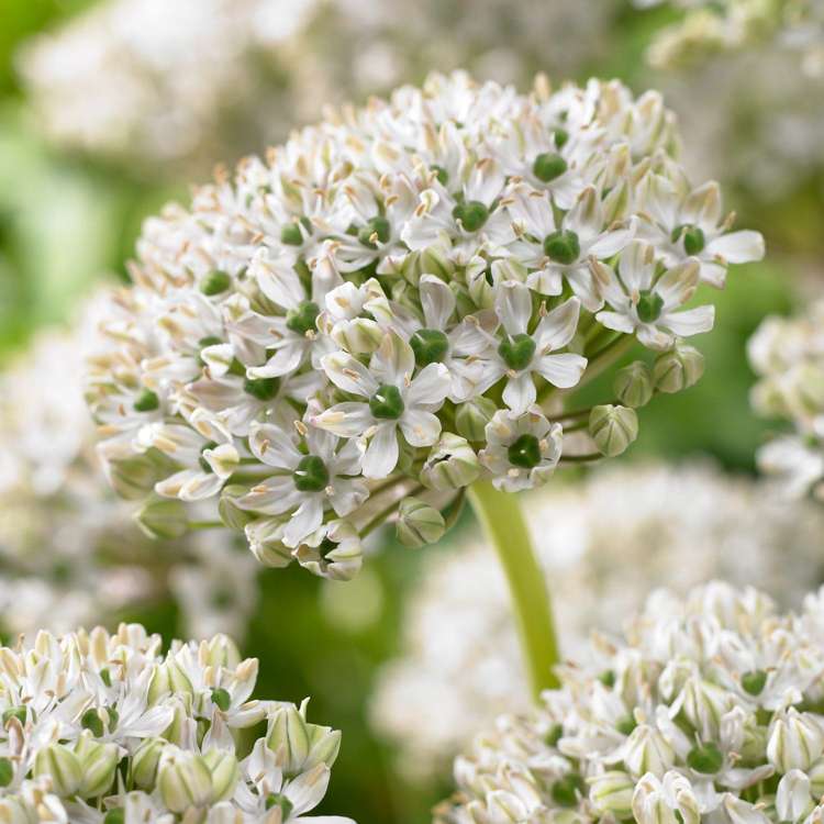 Allium 'Nigrum' är en elegant och robust prydnadslök som blommar i juni med platta, paraplyformade blomställningar i elfenbensvitt med ett grönt skimmer i mitten av varje stjärnformad blomma. Trots namnet är blomman inte svart – det syftar istället på de mörka frön som följer efter blomningen.