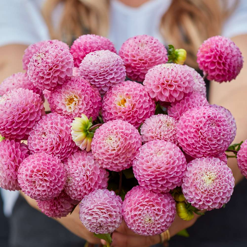 Dahlian 'Maaike' är en fin pompom-dahlia som slår ut i den vackraste rosa nyansen. Blomhuvudena är mycket täta och blir 5-10 cm i diameter, medan plantan når en höjd på 80-100 cm. Den rosa färgen passar bra ihop med många andra färger, så du kan blanda den med andra sorter i rabatten.