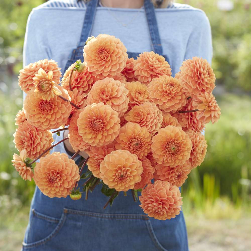 Dahlian 'Sylvia' för tankarna till sol och sommar med sina varma färger. Förvänta dig ett överflöd av gyllene orange blommor från denna favorit dahliaboll. Blommorna kommer i massor på höga stjälkar som är utmärkta som snittblommor. Blomhuvudet blir 6-10 cm och hela plantan blir 80-100 cm.