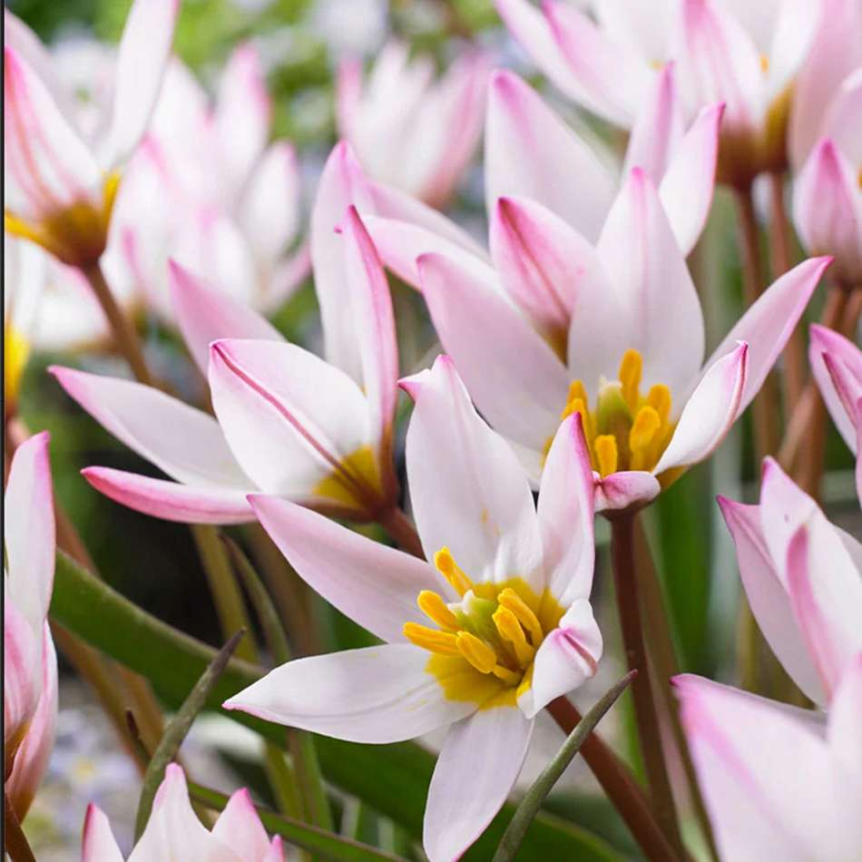 Tulpanen 'Hilde' är en botanisk tulpan med fin, naturlig grace och ett lätt, nästan svävande uttryck som blommar i april. Blommorna öppnar sig i soliga timmar och avslöjar en insida i ren vit med varm gul bas, medan utsidan är mjukt rosa till ljuslila – en diskret men raffinerad färgkontrast. När blommorna slår ut helt får de en stjärnformad siluett och bärs av korta stjälkar, cirka 15 cm höga. 'Hilde' passar särskilt bra i stenpartier, krukor och naturalistiska planteringar, där hennes vilda och eleganta karaktär verkligen får komma till sin rätt. Ett litet men lysande tillskott till den tidiga våren.