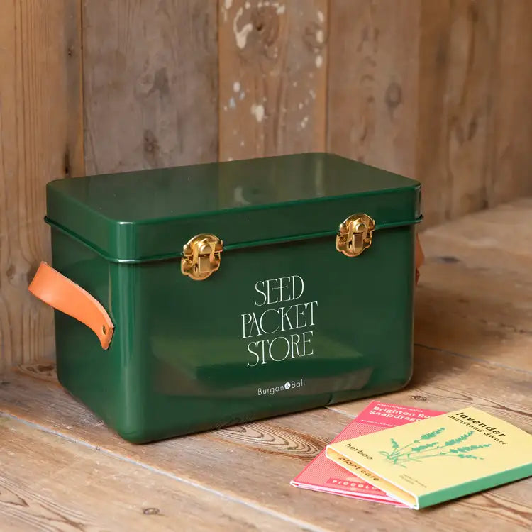 Men förutom att vara vacker är denna fröburk också mycket praktisk. Två starka metallspännen håller det gångjärnsförsedda locket säkert stängt, och inuti finns tre separata fack som gör det enkelt att organisera fröna redo för sådd. Ett av facken löper till och med på längden, så att även de största fröpåsarna får plats. Medföljande månadskort hjälper dig att hålla koll på när dina frön ska sås.