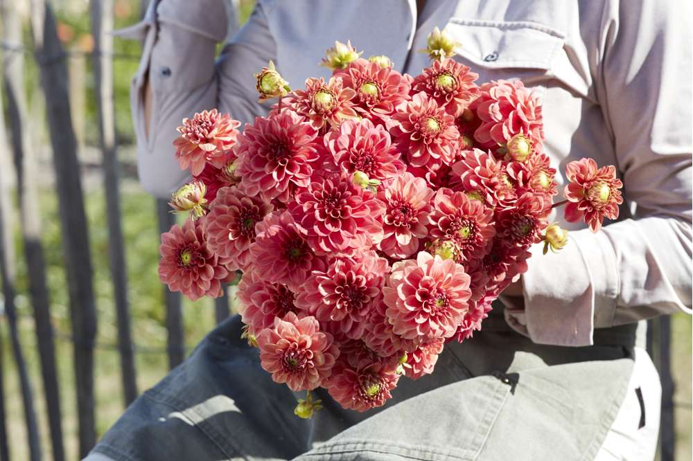 Dahlia 'Iced Tea' är en dekorativ dahlia med ca 14 cm stora blommor. De fina kronbladen har en fin kopparfärg, nästan gyllene med en mörkare mitt.