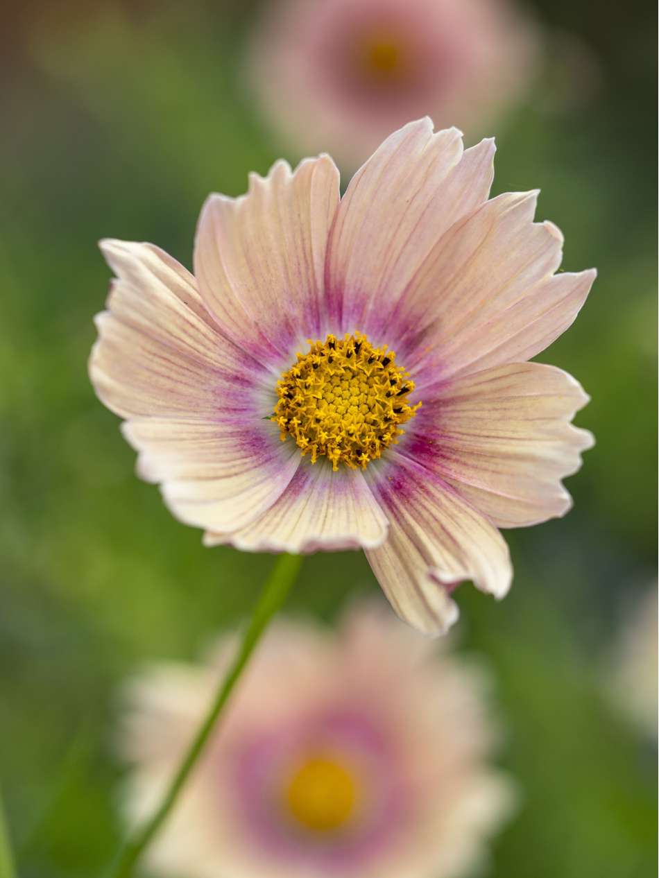 Cosmos 'Apricot Lemonade' har fina blommor i mjuka aprikos-, rosa- och krämiga citronfärger som skapar en charmig, pastellfärgad dekor i trädgården. Denna lättodlade ettåriga växt trivs i full sol och väldränerad jord och är perfekt för rabatter eller krukor utomhus. Den blommar rikligt under hela sommaren och en bit in på hösten och lockar till sig pollinatörer.