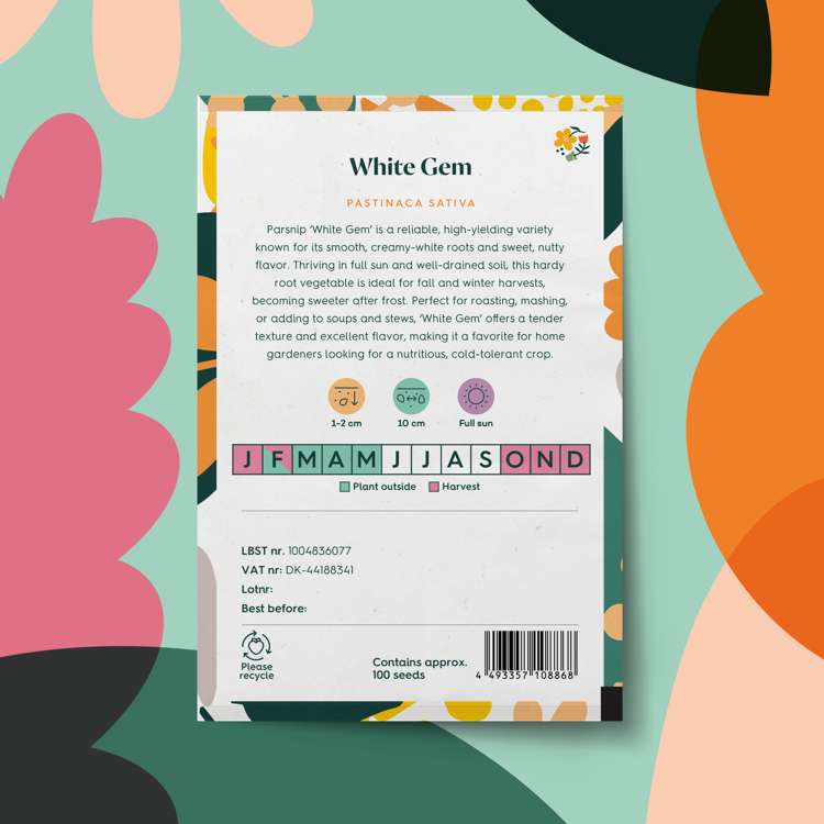 Palsternacka 'White Gem' är en pålitlig, högavkastande sort som är känd för sina mjuka, gräddvita rötter och sin söta, nötiga smak. Denna härdiga rotfrukt trivs i full sol och väldränerad jord och är idealisk för höst- och vinterskörd och blir sötare efter frost. 'White Gem' är perfekt att rosta, mosa eller lägga i soppor och grytor och har en mjuk konsistens och utmärkt smak.