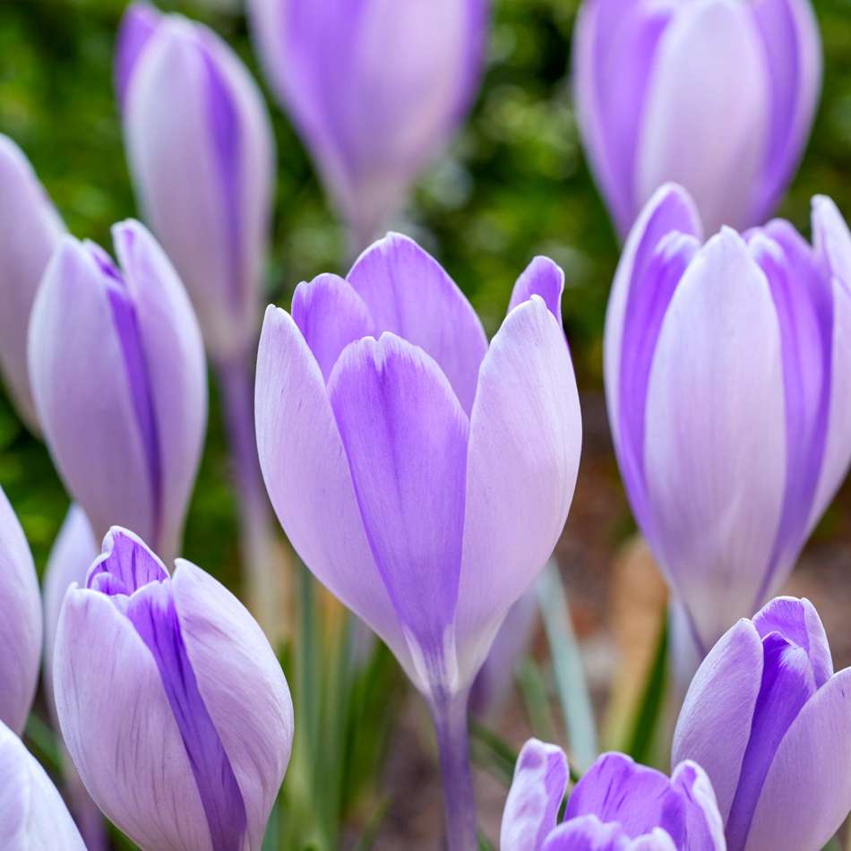 När solens första strålar träffar jorden vecklar 'Vanguard' ut sina stora, bägarlika blommor i en mild grålila nyans som fördjupas mot mitten i mjuk ametistviolett. De varma orange ståndarna bildar en skarp kontrast och blir ett levande blickfång i den dämpade färgpaletten. 'Vanguard' är en av de allra första storblommiga krokusarna på våren, och dess livfulla blomning varar i 2–3 veckor.