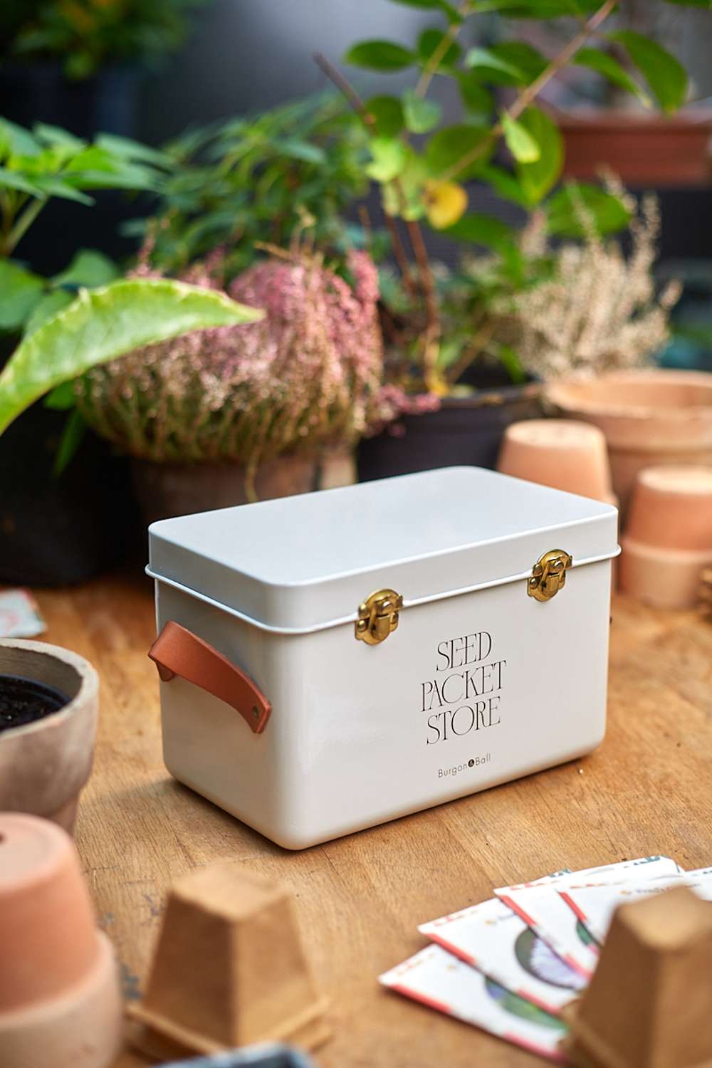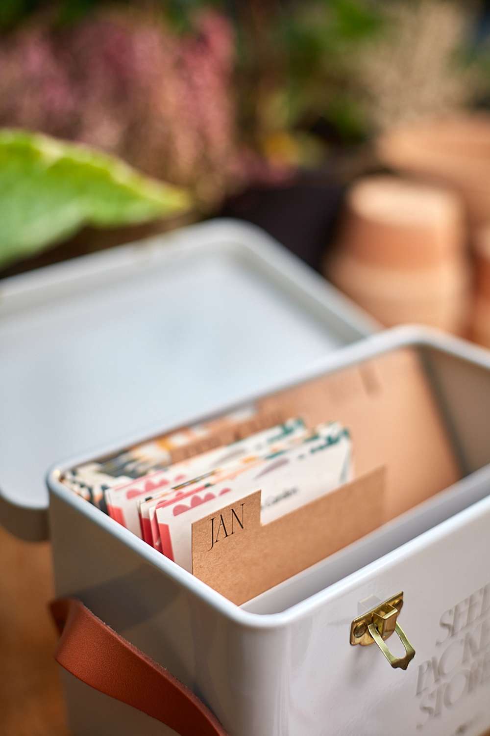Men förutom att vara vacker är denna fröburk också mycket praktisk. Två starka metallspännen håller det gångjärnsförsedda locket säkert stängt, och inuti finns tre separata fack som gör det enkelt att organisera fröna redo för sådd. Ett av facken löper till och med på längden, så att även de största fröpåsarna får plats. Medföljande månadskort hjälper dig att hålla koll på när dina frön ska sås.