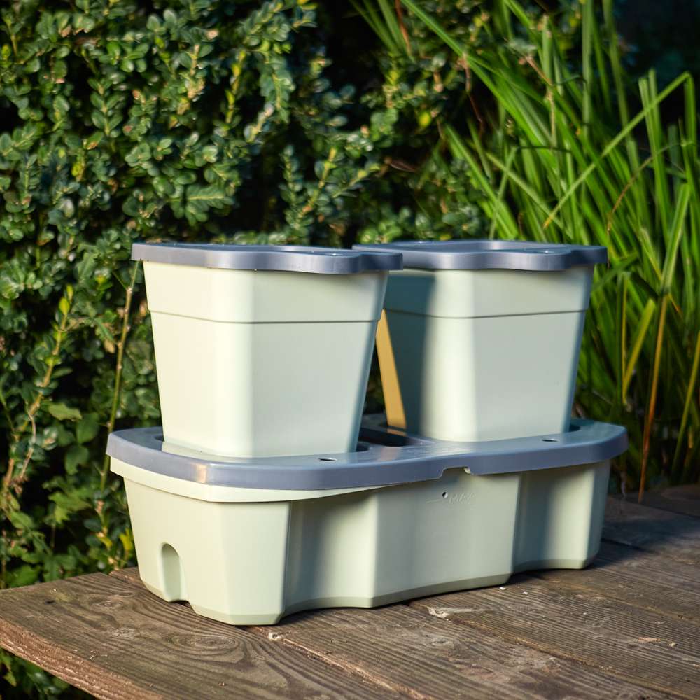 Duogrow är ett självvattnande planteringssystem med två krukor som vattnar växterna vid optimala tidpunkter och håller jorden på perfekt fuktnivå. Varje kruka rymmer 11 liter.