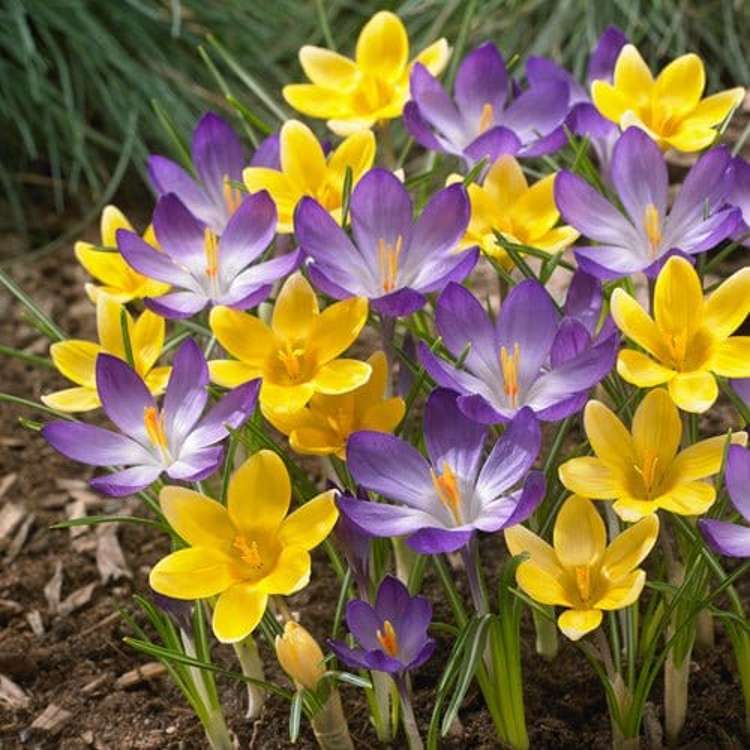 ‘William’ är en livlig krokusblandning i guldgult och violett – en riktig färgexplosion i vårens allra första skede. De starka kontrasterna väcker liv i gräsmattor, rabatter eller krukor innan något annat hunnit börja blomma.
