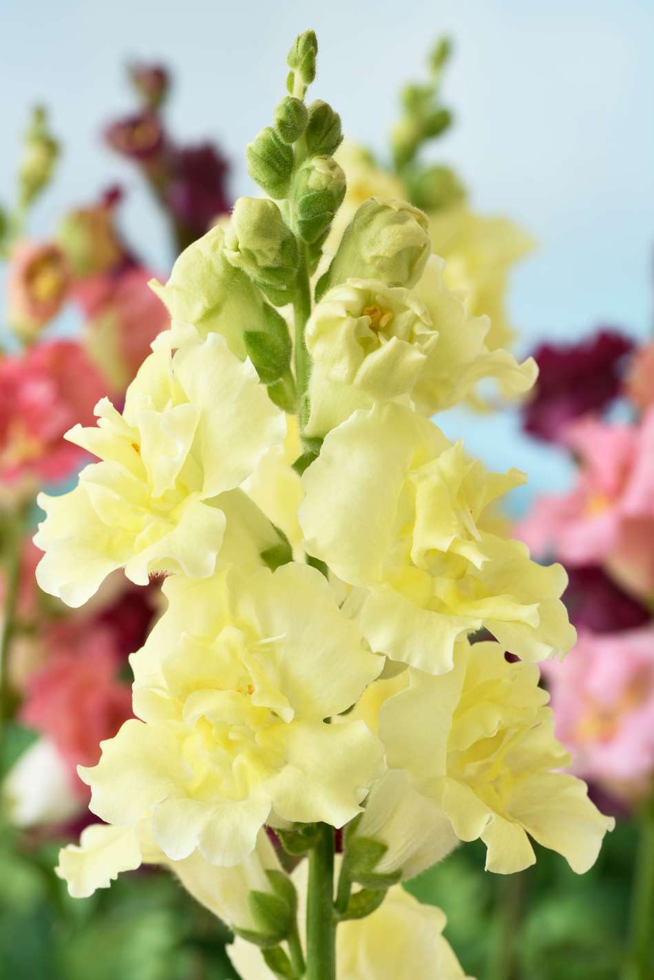 Lejongap 'Madame Butterfly Yellow' har ljusa, fyllda blommor i en vacker smörgul färg. De höga, eleganta axen ger värme och charm till trädgårdsrabatter och buketter. De är utmärkta som snittblommor och trivs i full sol och väldränerad jord. Ett vackert tillskott i en ljus och solig trädgård.