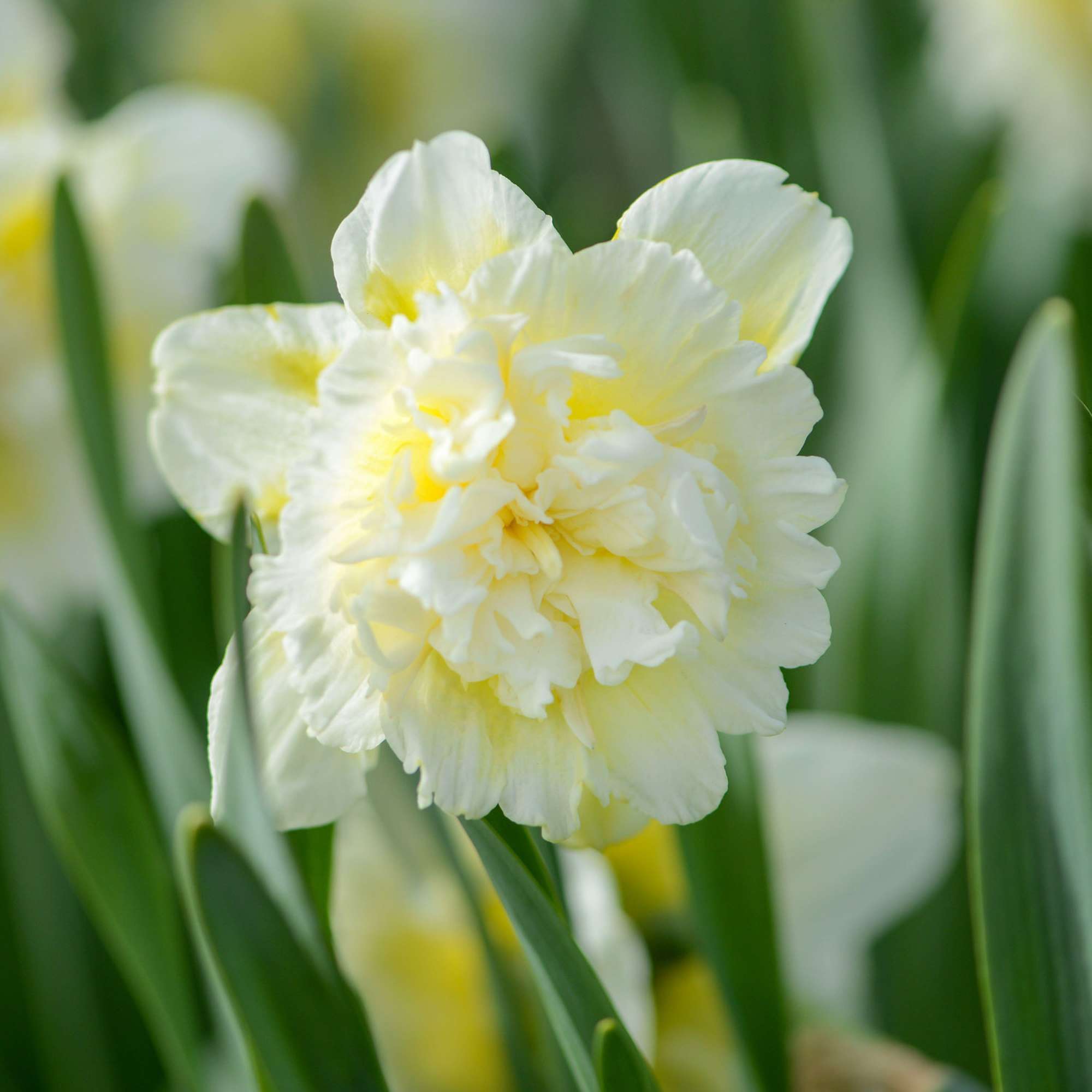 Narciss ‘Ice King’ är en spektakulär och majestätisk narciss som förenar styrka och elegans i en överdådig blomning. Dess stora, dubbla blommor öppnar sig i en blandning av krämgula och elfenbensvita nyanser, och när blomman mognar bleknar det gyllene centrumet gradvis till en mild gräddfärg.
