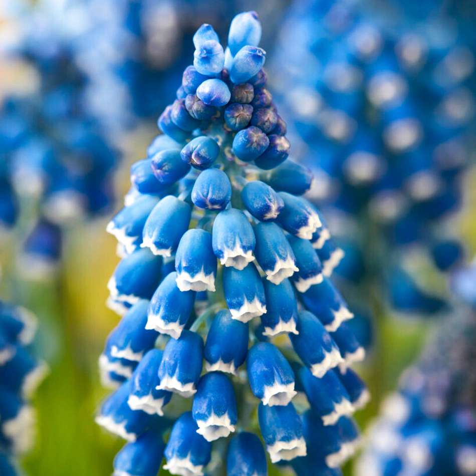 Pärlhyacinten 'Soulmate' skänker en stillsam och poetisk charm till trädgården med sina eleganta, täta klasar av små, klockformade blommor. Blommorna öppnar sig i en unik tvåfärgad kombination av mjukt dammigt blålila med små vita spetsar på varje klocka, vilket ger en subtil, skimrande effekt.
