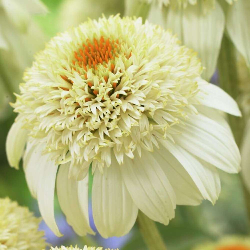 Röd solhatt Echinacea 'Milkshake' är en unik och fantastisk sort som får stora, fyllda blommor med gräddvita kronblad och en frodig, fyllig mitt av orange pollen. Den här perennen trivs i full sol och väldränerad jord och blommar från midsommar till höst, vilket gör den till en pålitlig sommarblomma i trädgården. Med sin robusta tillväxt och sitt iögonfallande utseende lockar 'Milkshake' fjärilar och bin samtidigt som den skapar en frisk, elegant atmosfär i trädgården.