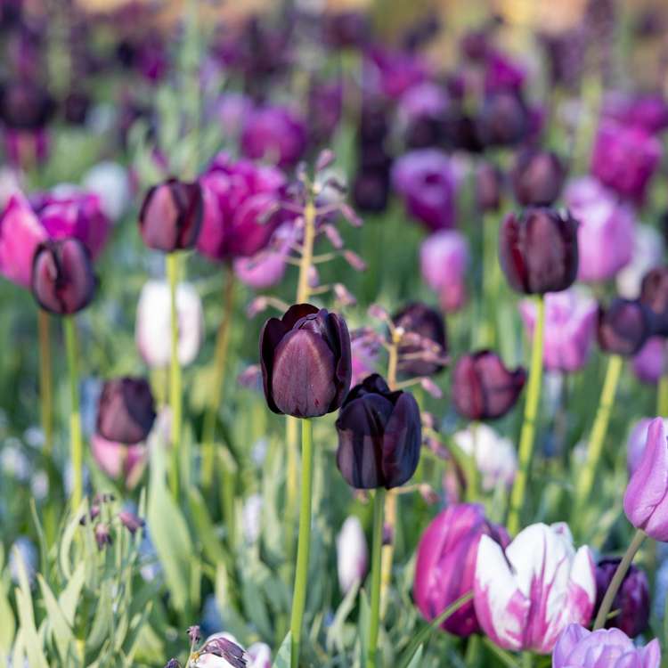 Mystery är en fängslande och sammansatt vårblandning i svala toner av lila, blått och vitt. Kombinationen av pärlhyacinter, mörka klockliljor och eleganta randiga tulpaner skapar ett sofistikerat men lekfullt uttryck. Blommar från mars till maj och ger en ständigt föränderlig energi till trädgården.