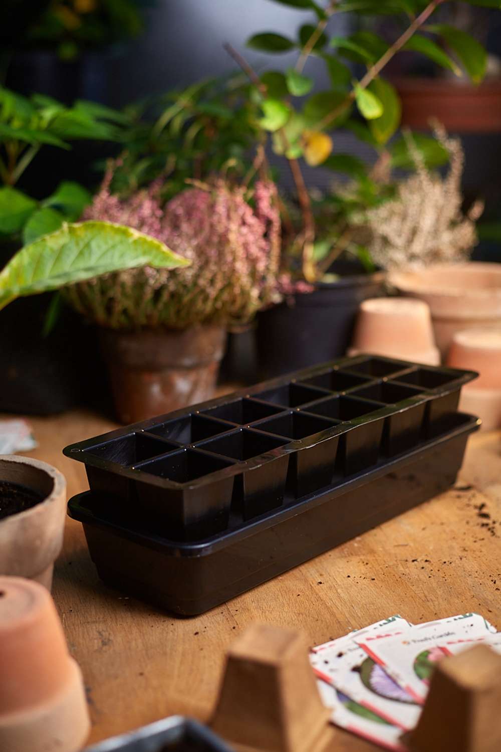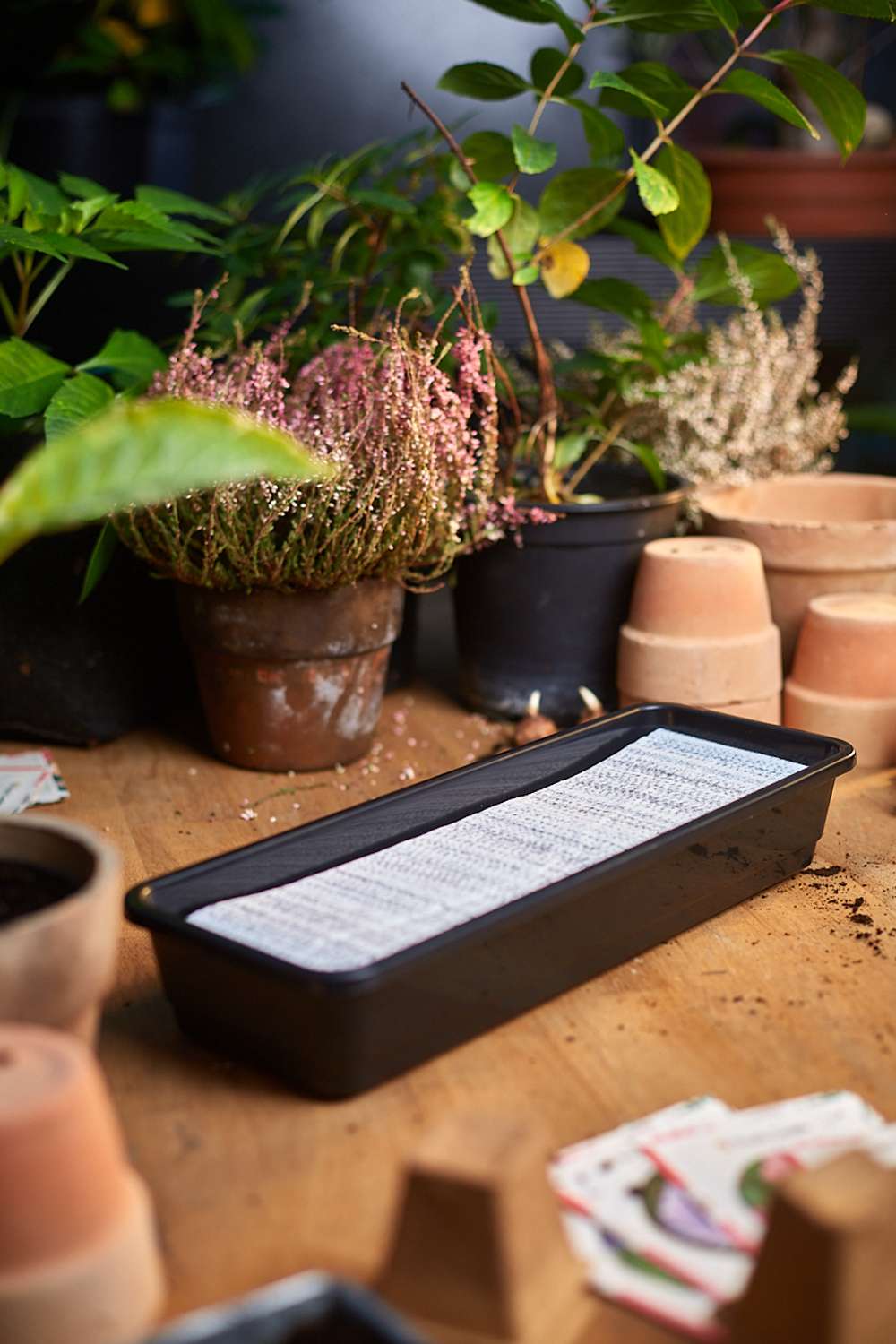 Det 5-delade setet är perfekt för fönsterkarmen och innehåller en reservoarbricka, en upphöjd plattform, 12 odlingsceller, en kapillärmatta och ett klart lock. Varje cell mäter 5 cm x 4,7 cm x 5,8 cm på djupet och rymmer 0,1 liter. Miniväxthuset kan återanvändas år efter år.